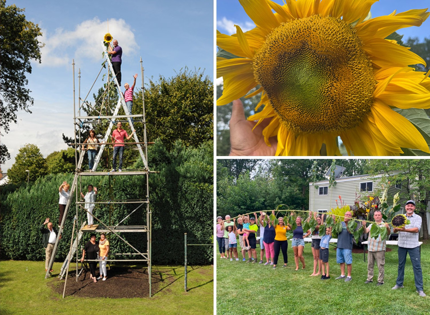 A família e os vizinhos segurando o maior girassol do mundo na horizontal