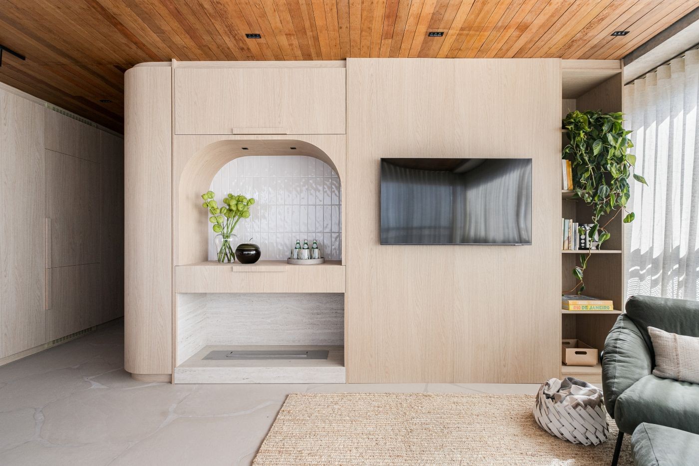 A marcenaria curva representa todo o espaço de armazenamento do estúdio e ainda esconde os eletrodomésticos
