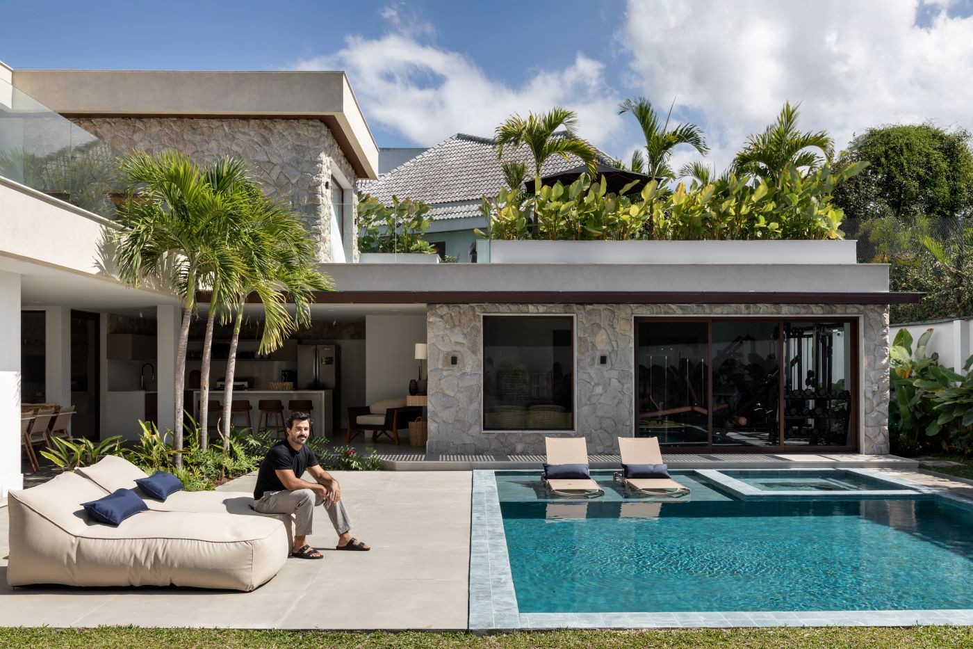 ÁREA EXTERNA | A piscina foi revestida de Barlavento Sea, da Portobello, enquanto o piso, de porcelanato Munari Cimento AC, da Eliane. A construção recebeu textura da Decor Colors nos tons Algodão Egípcio e Avelã (mais escuro), ao passo que, em uma das faces da fachada, destaca-se a pedra moledo. Mobiliário do acervo dos moradores. No paisagismo pensado pelo escritório Maze Arquitetura, com plantio executado pelo Horto da Represa, destacam-se as três palmeiras-veitchias no canteiro rodeado por guaimbê e helicônia-papagaio. Ao lado, na área sombreada, está plantada a espécie costela-de-adão. Já abaixo da janela, foi utilizada a moreia