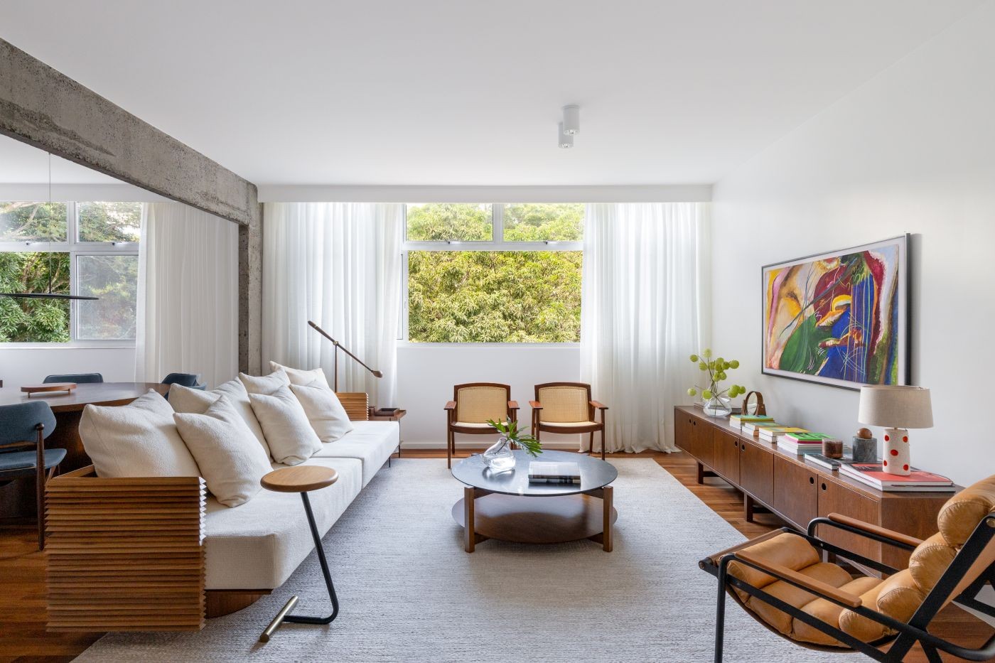 Na sala de TV e estar, o rack LF parece flutuar sobre a estrutura de madeira maciça, enquanto a mesa de centro Tê combina linhas puras e tampos chanfrados para criar uma presença sólida. A mesa lateral Bandeja, com estrutura metálica esbelta e tampos em madeira, aparece como elemento curinga.