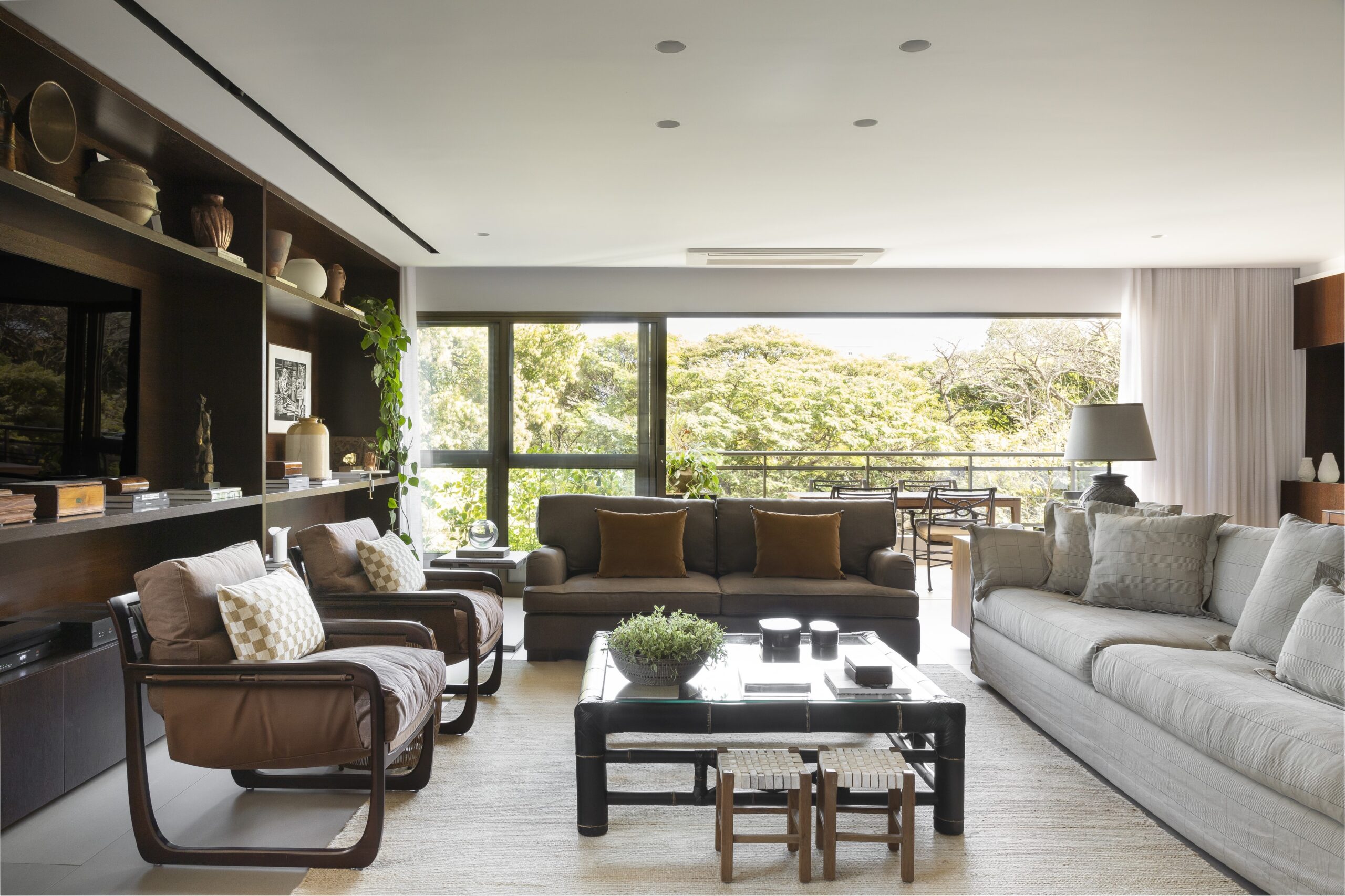 Este apartamento em Ribeirão Preto tem paredes que contam histórias antes de qualquer outro elemento entrar em cena. Com vista direta para as copas das árvores de uma praça – uma raridade urbana que se estende por toda a fachada –, a morada é assinada pelo arquiteto Gabriel Figueiredo e pelo designer de interiores Fabricio Frezza, do Frezza & Figueiredo. Em todos os ambientes, há telas emolduradas, ora sozinhas, ora acompanhadas.