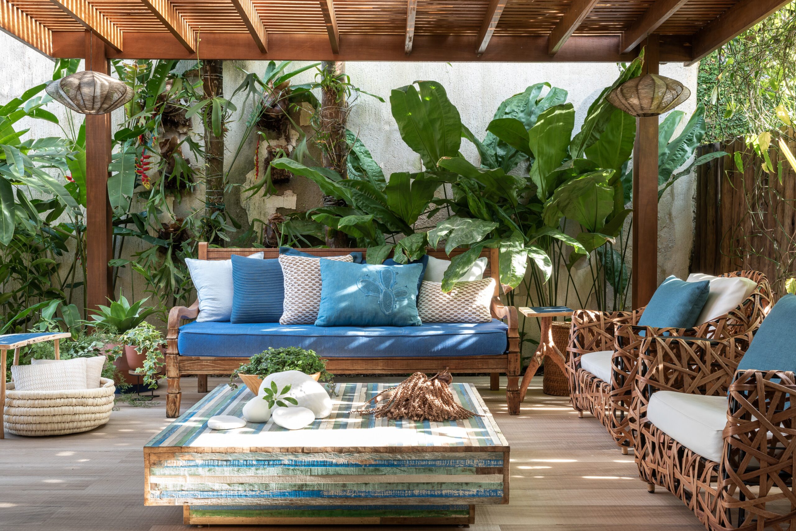 Este jardim, repaginado pela paisagista Clariça Lim, ganhou uma poltrona aconchegante de vime