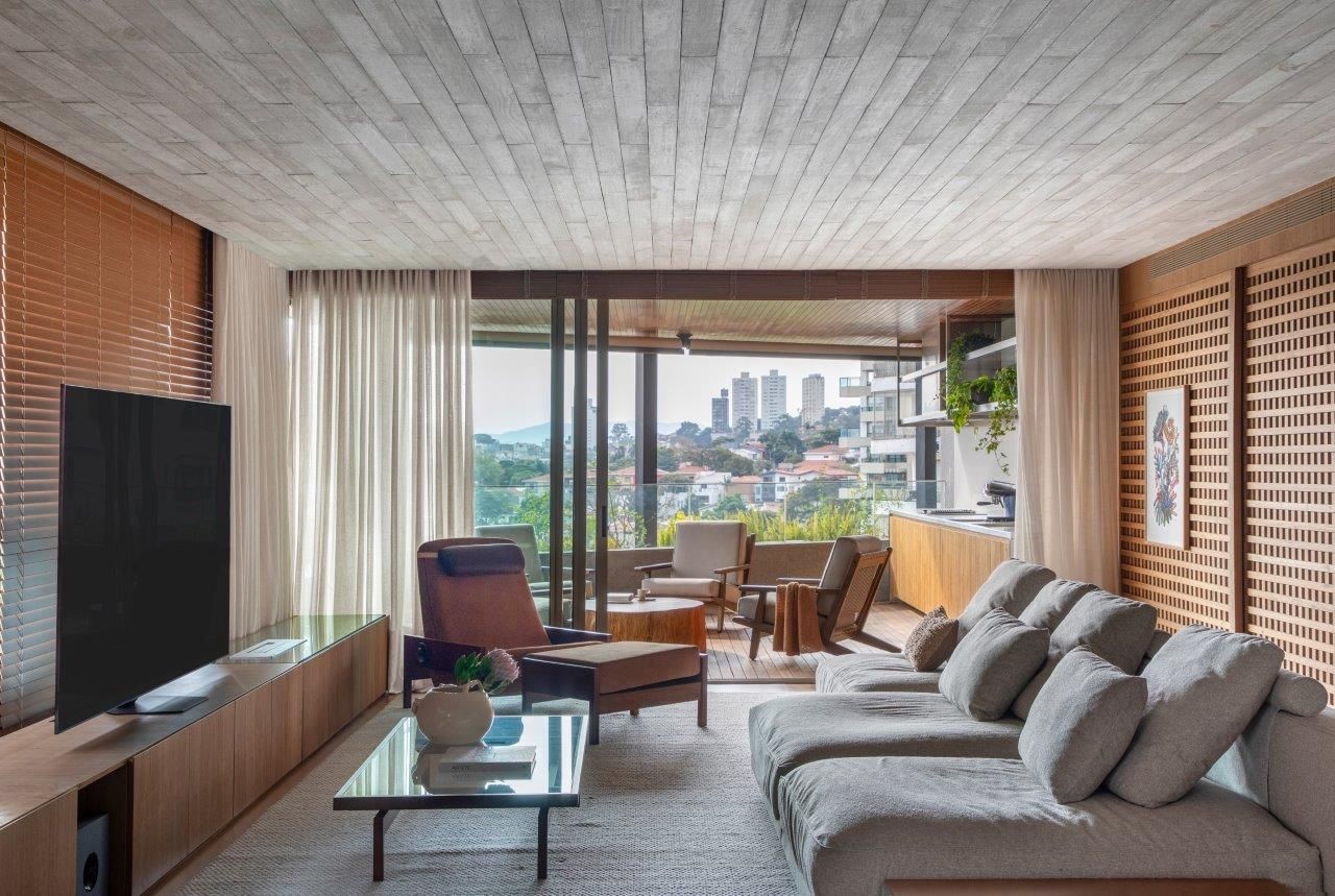 Artista, a proprietária solicitou um espaço para chamar de seu. Dessa forma, a área social conta com um pórtico de muxarabi em lâmina de madeira cabreúva que esconde um charmoso ateliê — e ainda fica de frente para a bela vista.