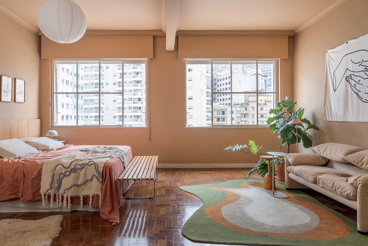 Nesse projeto, o tom terroso se expande da parede até parcela do teto conferindo um ar intimista para a região da cama