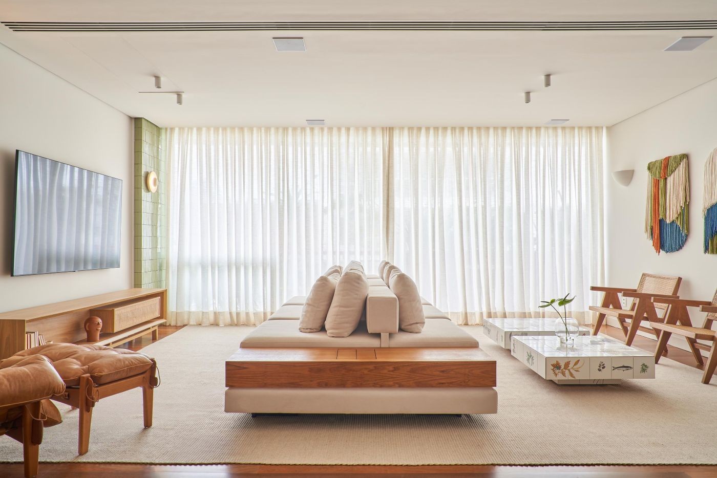 Entre os destaques, estão as mesas de centro com azulejos de Calu Fontes, desenhadas especialmente para o projeto, e o quartzito Botanic Green usado no tampo do aparador de jantar e no lavabo — suas veias lembram reflexos do sol no fundo do mar.
