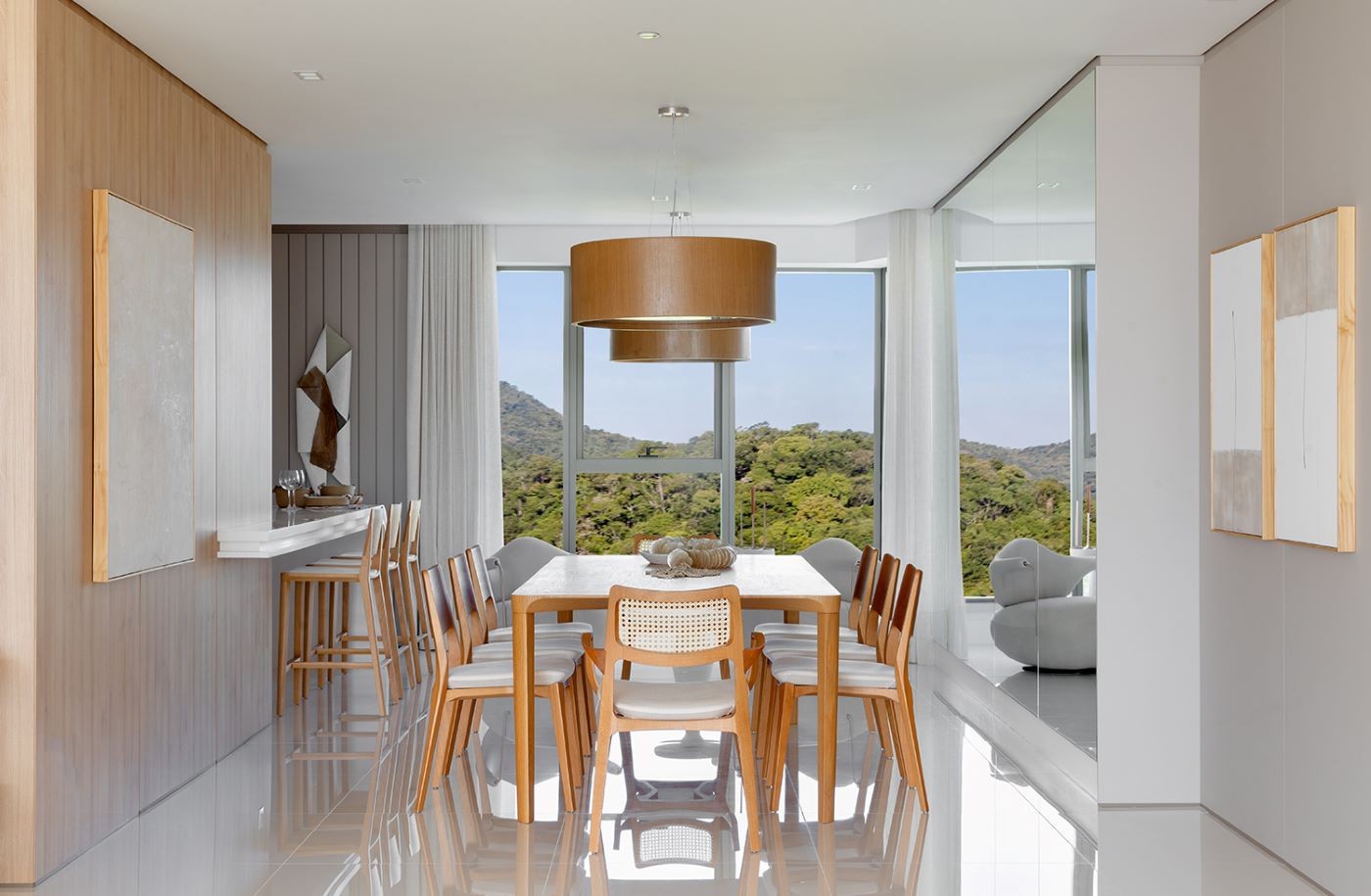Na sala com piso branco, marcenaria executada em lâmina natural de freijó catedral pela Holanda Móveis Planejados, com porta articulável para a cozinha. Mesa de refeições com cadeiras MiMing, de Philippe Starck, e bufê, todos adquiridos na Lilia Casa. Quadro maior, azul, de Carlos Araújo. Ao lado, quadro laranja, de Roberto Burle Marx. Na parede, à direita, quadro com paisagem, de Wolfgang Sulzer. Sobre o bufê, a cerâmica rosa é de autoria de Karim Rashid, enquanto a branca com estampa azul e vermelho, de Jaime Hayon. Luminária pendente da Center Luz