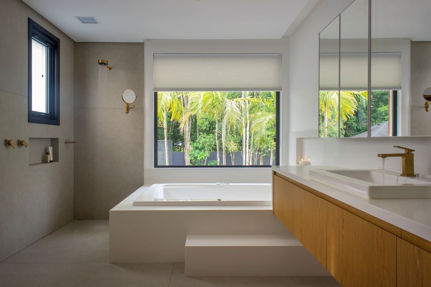 A facilidade de limpeza e a menor escorregabilidade em relação às opções polidas tornam o porcelanato acetinado uma solução adequada tanto para banheiros internos quanto externos. “Os materiais brilhantes destacam a sujeira e as imperfeições, aumentando a complexidade da sua manutenção periódica”, afirma Rodrigo Angulo, arquiteto do escritório SAMPA arquitetura + design.