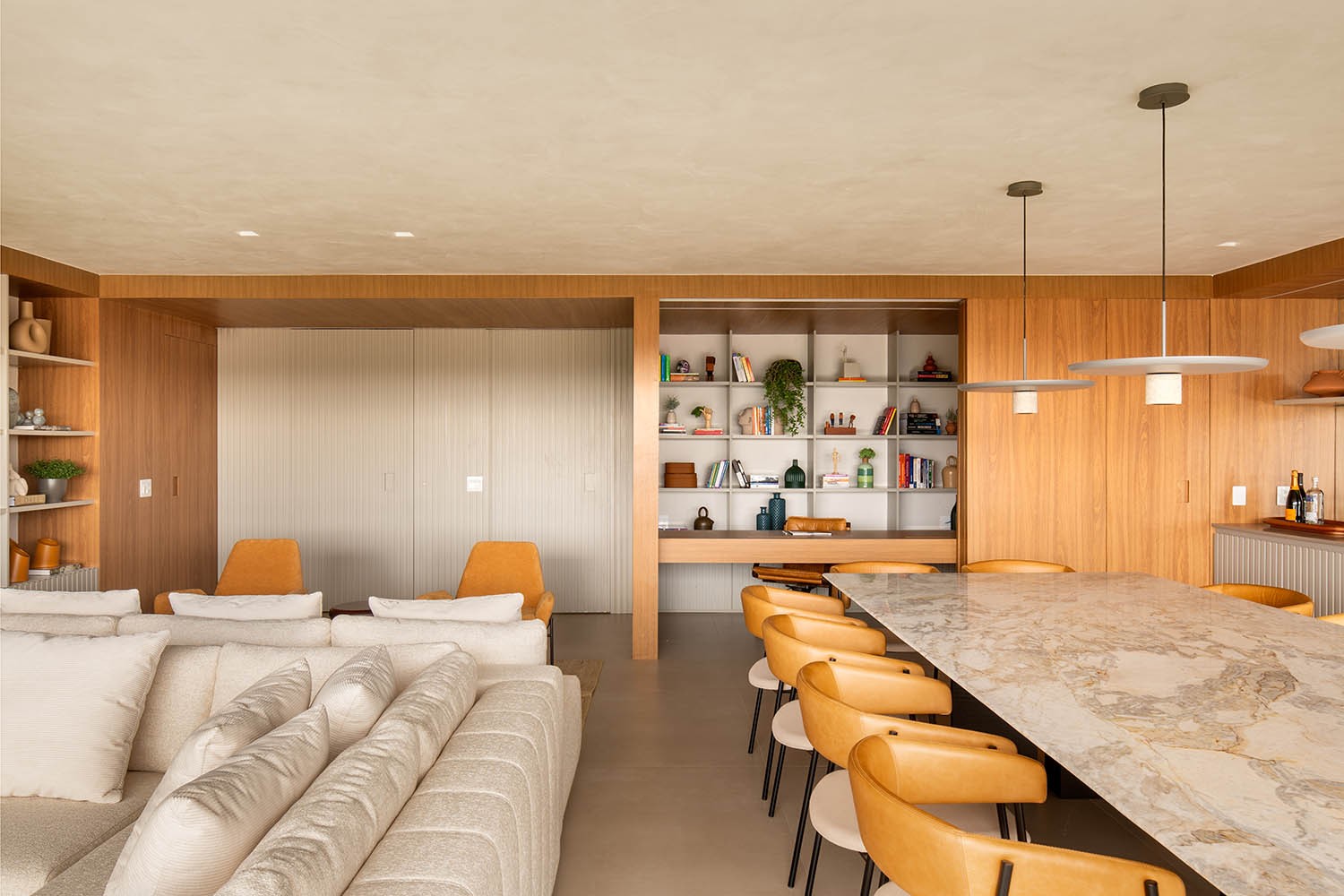 A lógica espacial deste projeto do escritório Conrado Ceravolo Arquitetos organiza sala de estar, jantar e home office como um único plano contínuo, articulado por elementos e materiais naturais. Desenhados para mediar os usos, estantes e painéis em marcenaria personalizada operam tanto como suporte funcional quanto como estrutura de composição visual, abrindo e fechando conforme as necessidades do dia a dia.