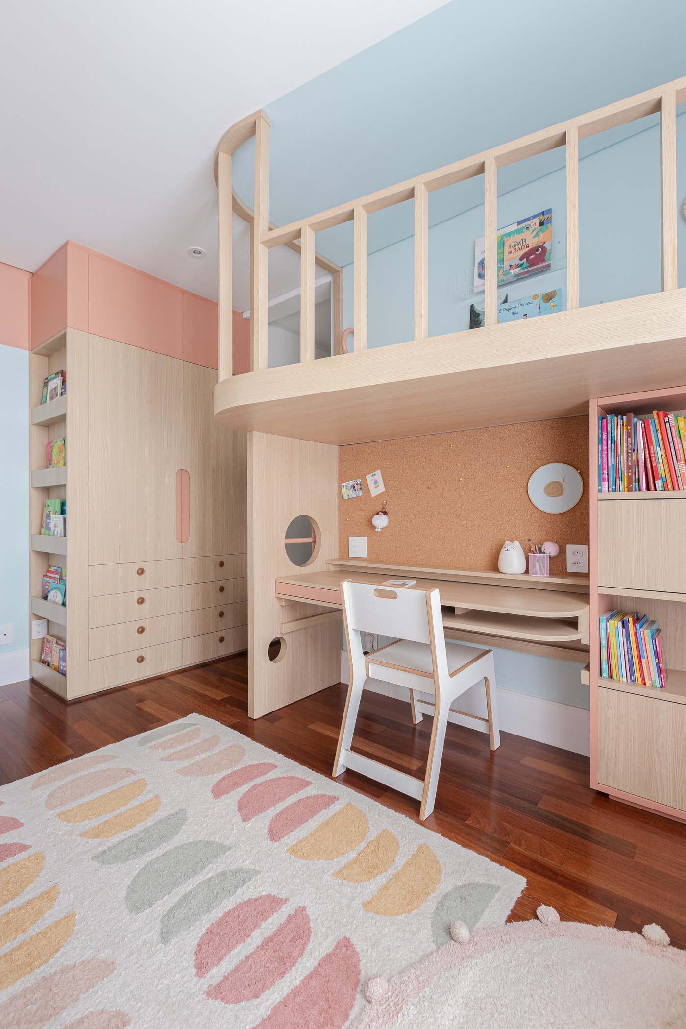 Abaixo do mezanino, Juliana posicionou uma escrivaninha voltada para os estudos — um pedido especial dos pais, que desejavam um ambiente que estimulasse a autonomia da filha. “Desenhei essa parte da marcenaria com uma mesa de estudos ajustável, que sobe conforme a necessidade. Assim, ela atende a Isis agora e no futuro. Quando ela crescer, basta elevar o conjunto e trocar a cadeira”, explica a arquiteta.