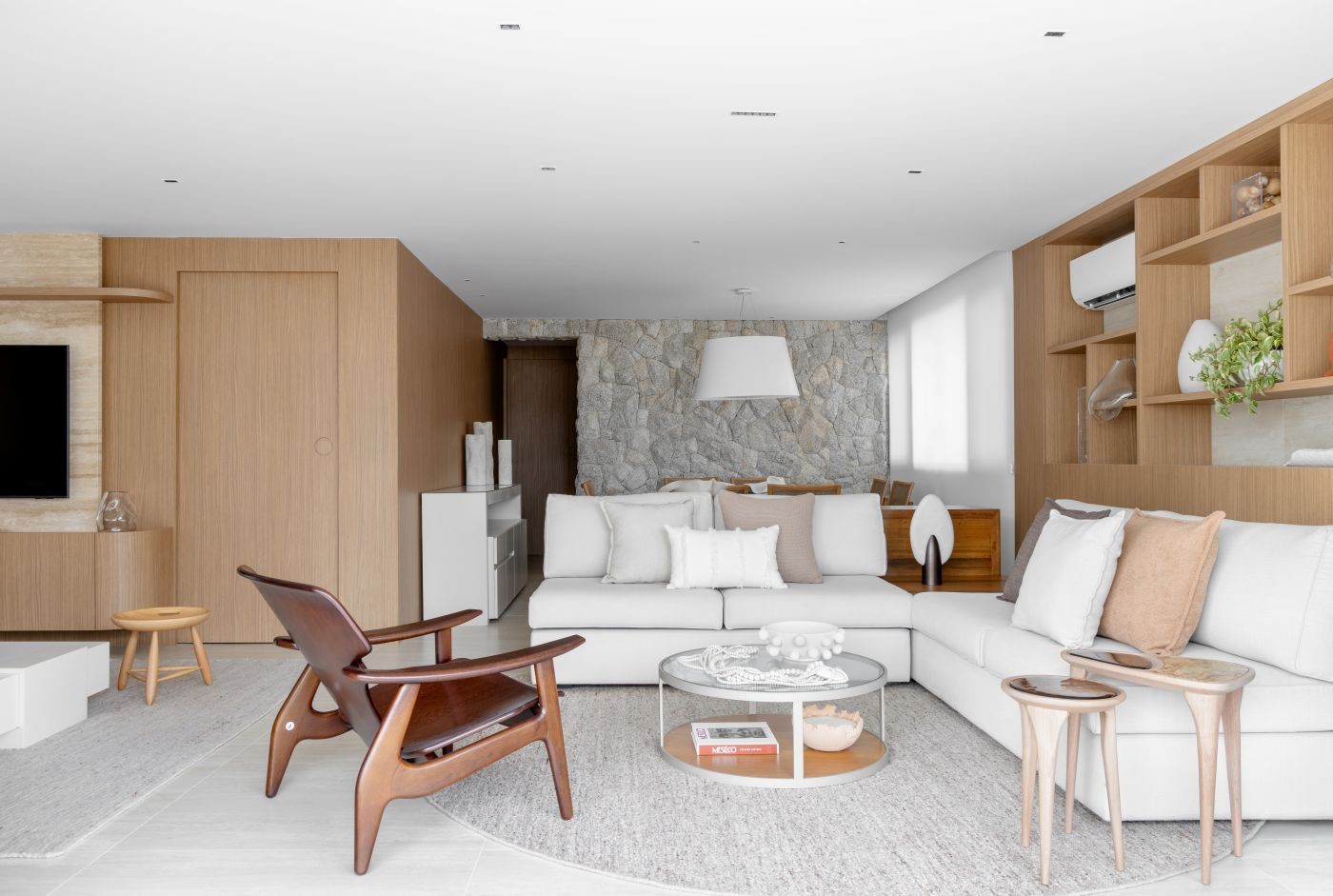 Logo no living integrado, a proposta do projeto se revela na combinação entre madeira e pedras naturais. A paleta de tons neutros, inspirada em nuances de areia e terrosos, cria uma base serena que dialoga com a paisagem litorânea.