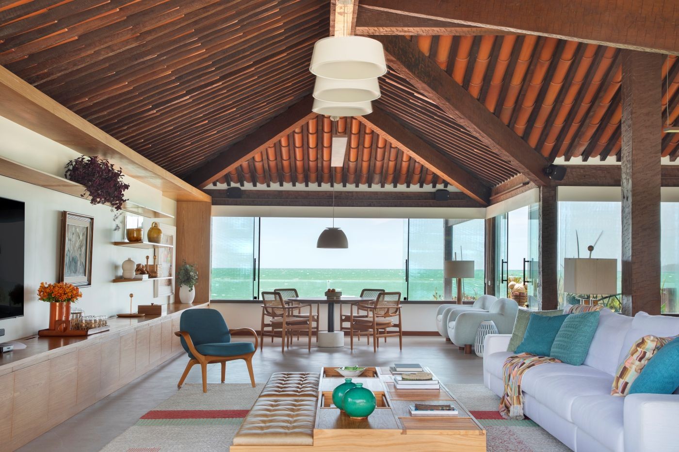 A escolha por uma decoração leve foi estratégica para equilibrar a presença marcante do telhado aparente e do madeiramento estrutural. “Esses elementos são muito fortes visualmente, então optamos por uma ambientação que não competisse com eles”, explica Paula.