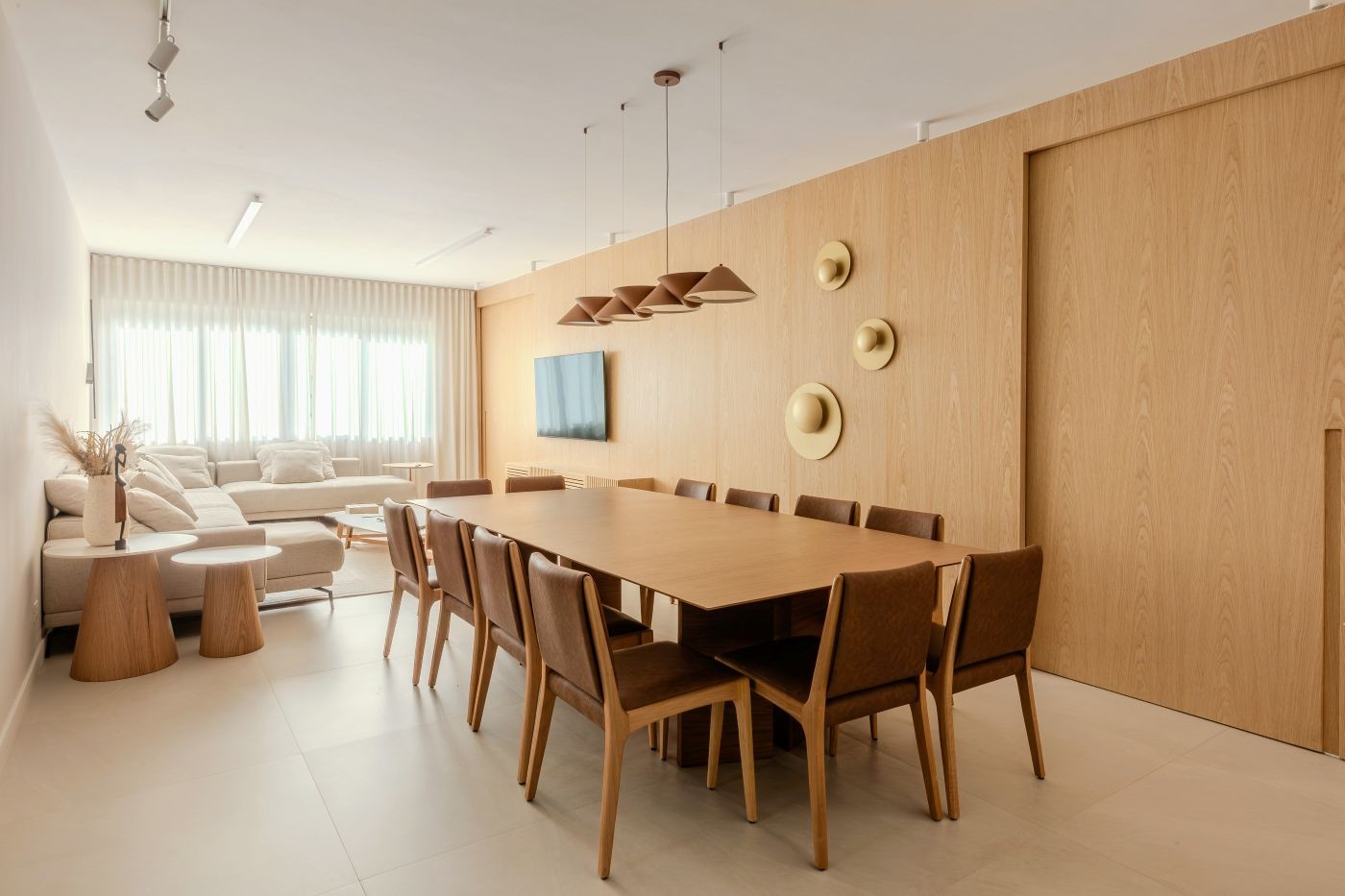 SALA DE JANTAR | A luminária pendente da designer Ana Neute para a Itens é o destaque da área social. Mesa de jantar Long, da Novo Ambiente, com cadeiras Joca, criação de Alessandra Delgado. Repare que no painel, feito de folha natural de carvalho americano pela Home Sweet Móveis Planejados, há uma porta de correr que pode integrar ou isolar a cozinha conforme a necessidade. Luminárias de parede da Yamamura