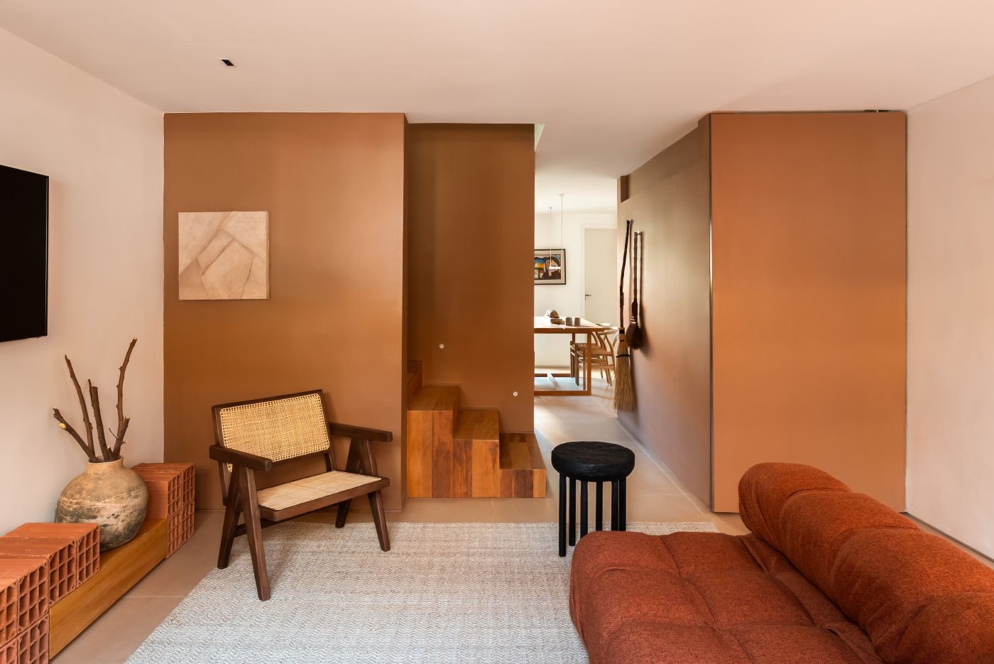 A paleta inspirada no tom do barro, aliada à presença da madeira, cria uma atmosfera acolhedora e silenciosa, onde a luz natural passa a ser protagonista. “Trabalhar com uma construção antiga exige cautela, mas também abre oportunidades para devolver qualidade espacial ao que estava adormecido”, observa o arquiteto.