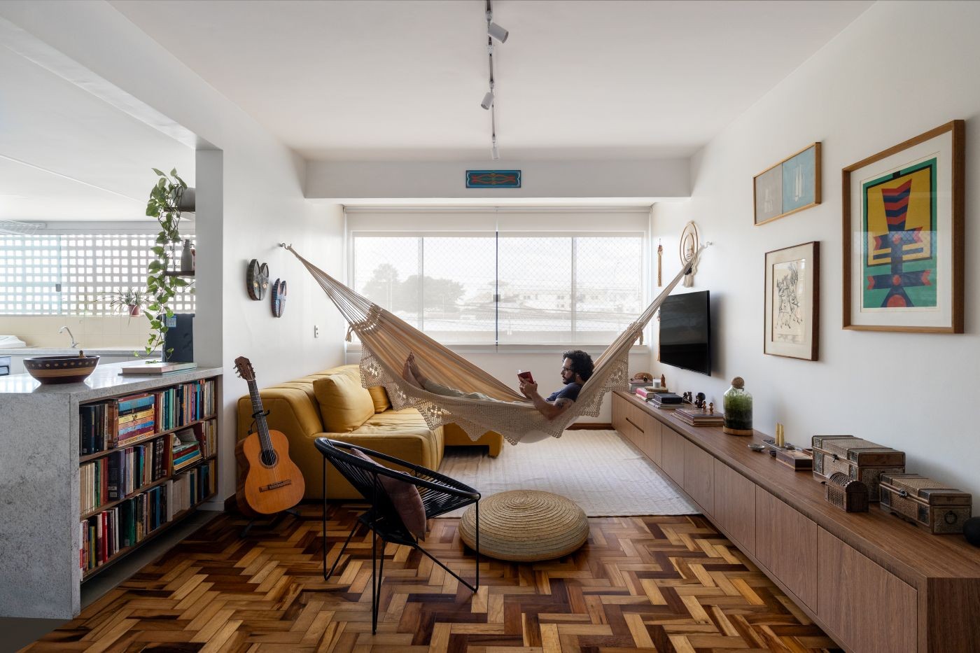 Neste apartamento de 100 m² no bairro do Guará, em Brasília, DF, uma reforma transformou completamente a forma como uma família vive o lar. Antes compartimentado e pouco iluminado, o imóvel ganhou novos ares após a integração da cozinha com a sala de estar, criando um living mais aberto, luminoso e convidativo para o cotidiano do casal e do filho pequeno.