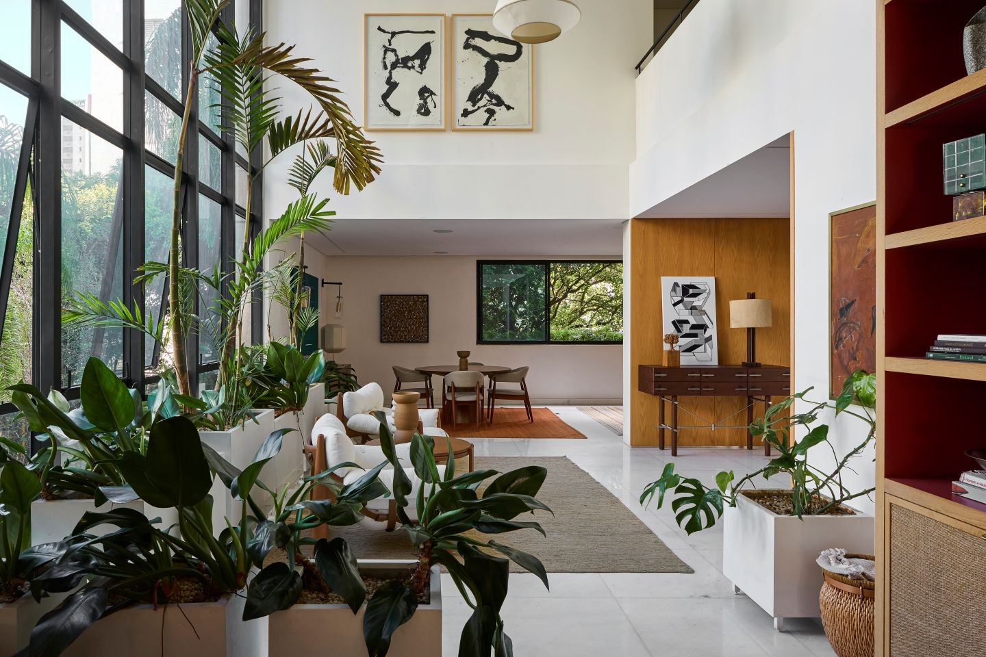 Reforma transforma apartamento dúplex em bosque particular com plantas e madeira