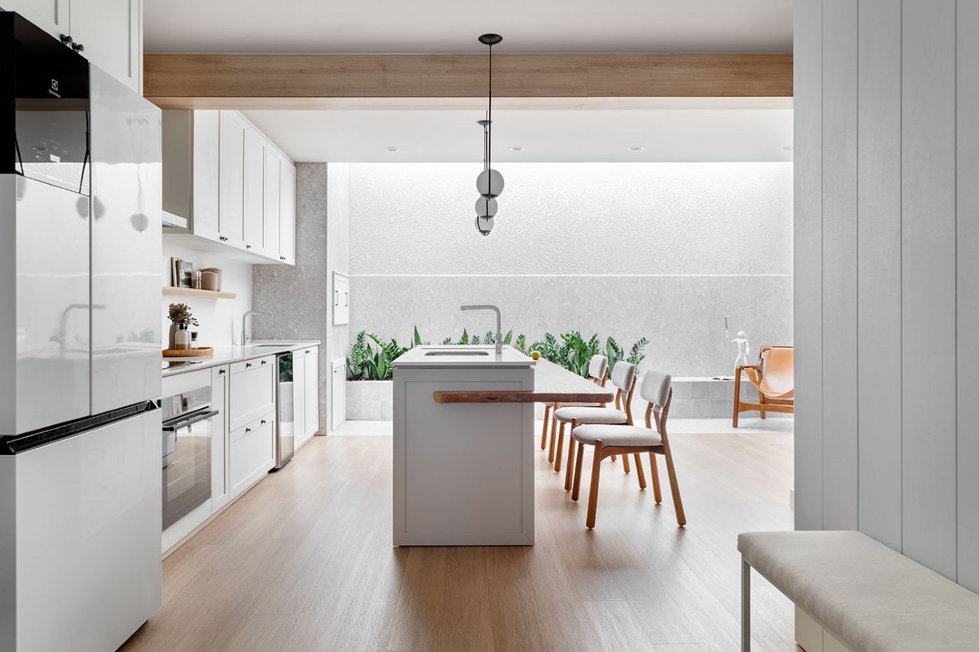 Assim, o que antes era o fundo da cozinha passou a se tornar o centro do cômodo social. “Com isso, criamos uma área única, ampla e luminosa. Isso mudou completamente a percepção de espaço da casa”, conta o arquiteto.