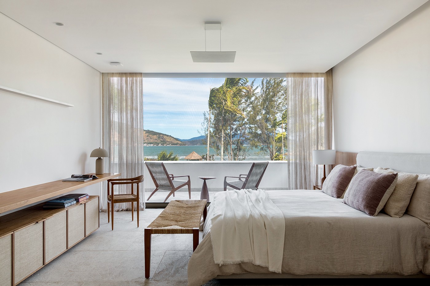 A vista para o mar orientou decisões importantes, como a posição da cama, permitindo que a paisagem seja contemplada de diferentes pontos e valorizando o visual.