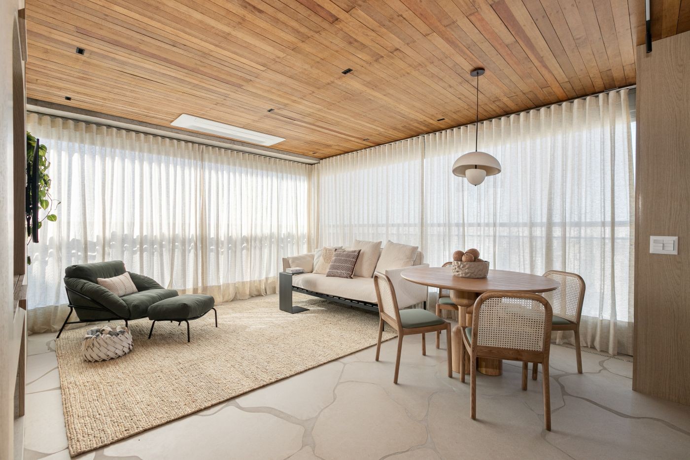 Neste ambiente, o tapete Gaya Hemp, da Phenicia Concept, torna o espaço de convivência mais acolhedor