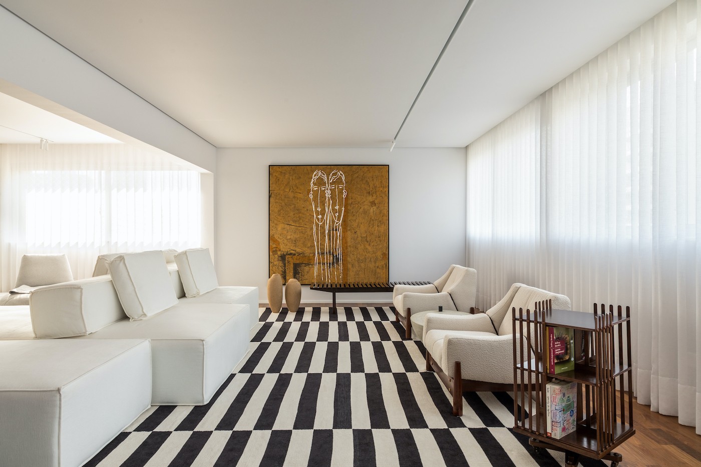Neste living, o tapete listrado, de Econyl, cria um ponto de destaque no cômodo com paleta predominantemente branca