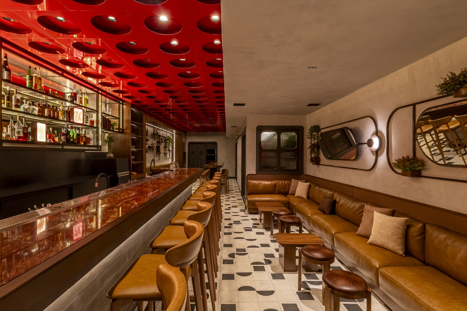 O teto vermelho, que remete a Ferrari Testarossa, é a grande assinatura do bar