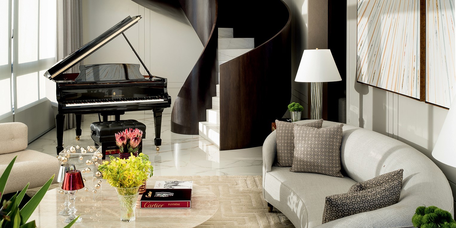 No living de pé-direito duplo, a escada, executada pela ICC Escadas, ganha protagonismo ao lado do piano da Steinway & Sons – o décor do ambiente conta ainda com sofá Monsieur e mesa de centro Lyon, ambos da Érea, almofadas com tecido da Sahco , abajures da Ralph Lauren, na Celina Dias, vasos da Baccarat e da Lalique, estes na Paula Bassini, com flores de Maria Emilia Morozini, conjunto de quadros de Bella Salvati, iluminação técnica da Signature e tapete da Avanti Tapetes