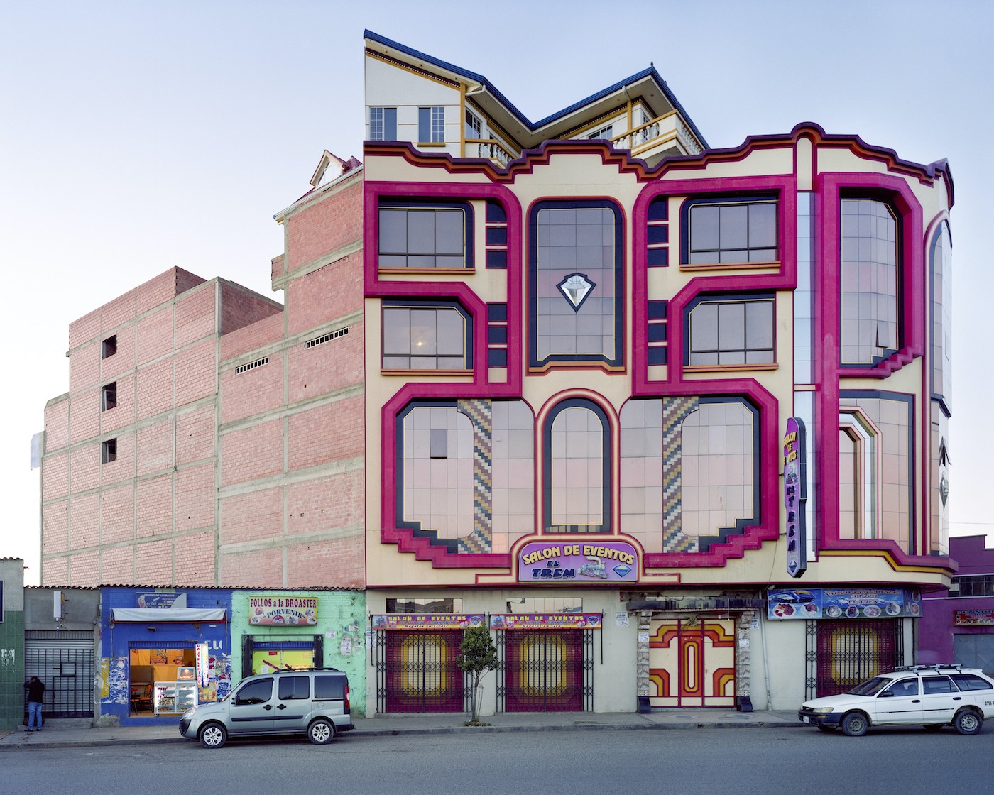 A curadoria, assinada por Ivo Giroto e Diego Matos, doutores pela USP, revela o ponto de partida do fotógrafo: o olhar voltado às construções extravagantes e multicoloridas que se tornaram símbolo da Bolívia. Popularmente conhecidos como cholets, esses edifícios combinam luxo, ornamentação intensa e referências indígenas contemporâneas.